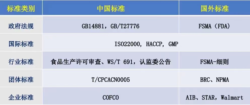 食品企業(yè)常見的審計標(biāo)準(zhǔn)有AIB、STAR,Walmart,BRC、NPMA、ISO22000、FSSC22000、GB14881.GB/T27776,HACCP,GMP,食品生產(chǎn)許可審查、WS/T 691、認(rèn)監(jiān)會公告,T/CPCACN005\COFCO等,我們評估體系在行業(yè)成為審計標(biāo)準(zhǔn)之一。審核標(biāo)準(zhǔn)得到了消費者及北美食品零售商的廣泛認(rèn)可,進(jìn)而被許多全求食品零售商和采購集團(tuán)用來作為對供應(yīng)商實施準(zhǔn)入的一道門檻。